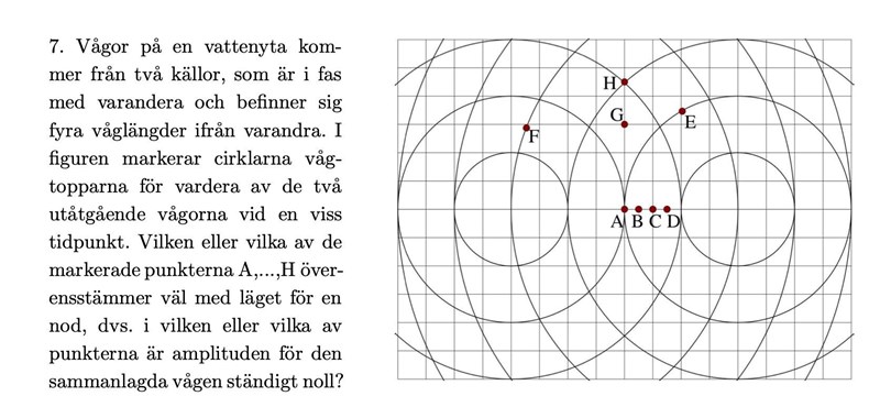 Uppgiften går ut på att du ska kolla var en vågtopp och en vågdal möts eftersom de då släcker ut varandra i den punkten och det blir en nod.