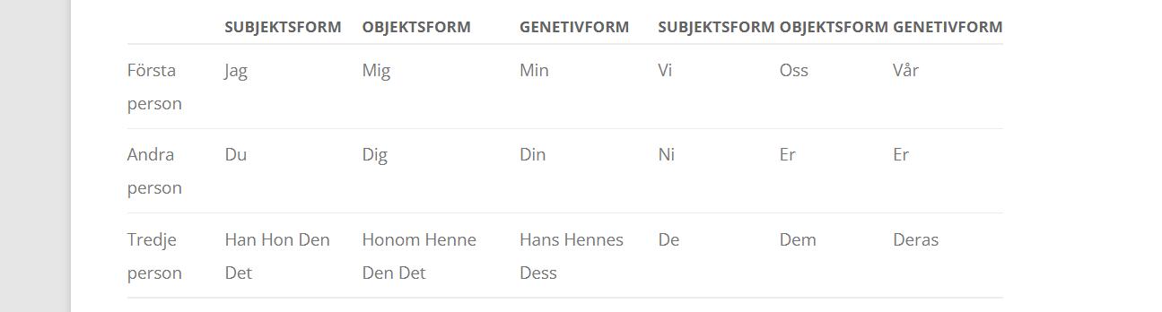 Vi hade i läxa att skriva några pronomen, i vilken form de står i samt i vilken typ av pronomen.