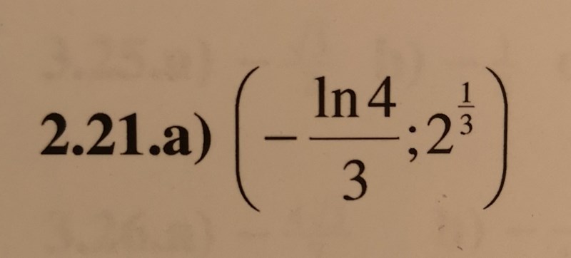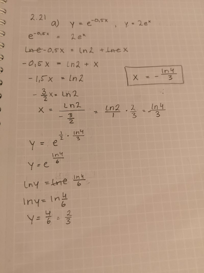 Du behöver inte ta ln av båda sidor för att räkna ut y. Det räcker att stoppa in ditt framräknade x=-ln(4)/3 i ekvationen så får du ut det