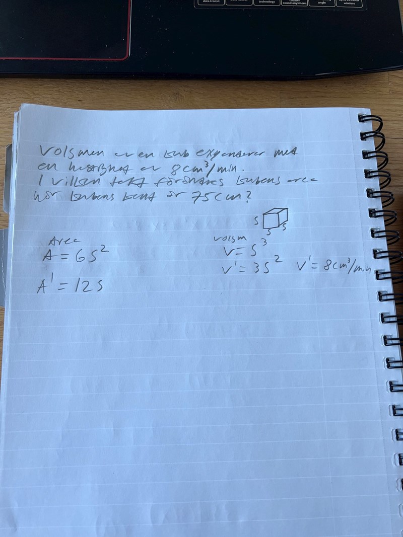 volymen av en kub expanderar med en hastighet av 8cm3/min. I vilken takt förändras kubens area när kubens kant är 75 cm?