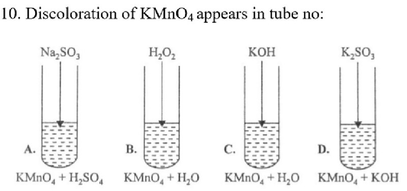 Vi vet att permanganatjonen (Mn2+) är färglös. Således ska vi välja den tub där KMnO4 övergår till Mn2+. Men vilken är tuben egentligen? Jag skulle uppskatta ett genomförligt svar så att jag förstår.