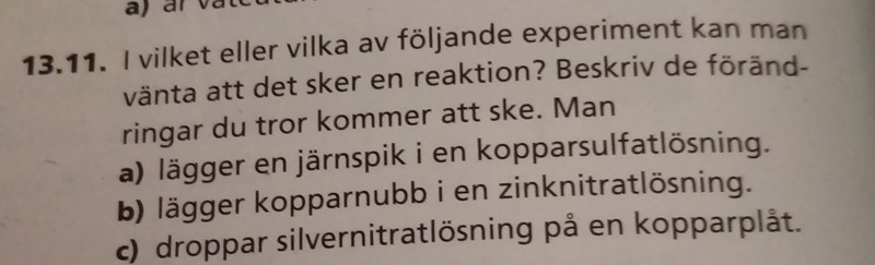 b) Koppar är ädlare än zink, så koppar "vill" vara i metallform och zink "vill" vara joner. Här är det redan så, så det sker ingen reaktion.
