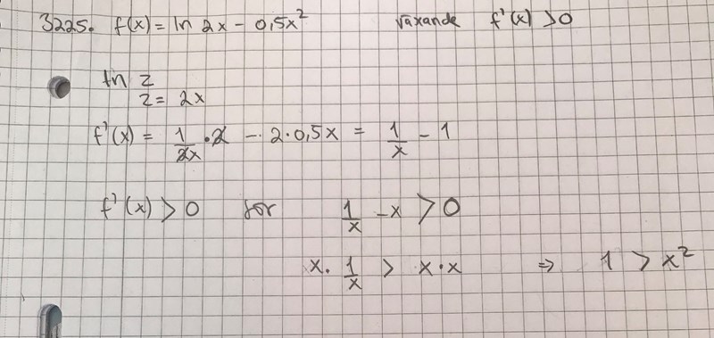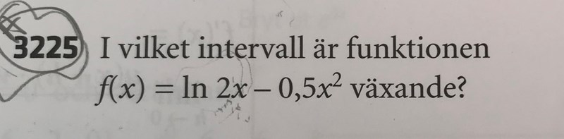 I vilket intervall är funktionen f(x)= ln 2x - 0,5x^2 växande?