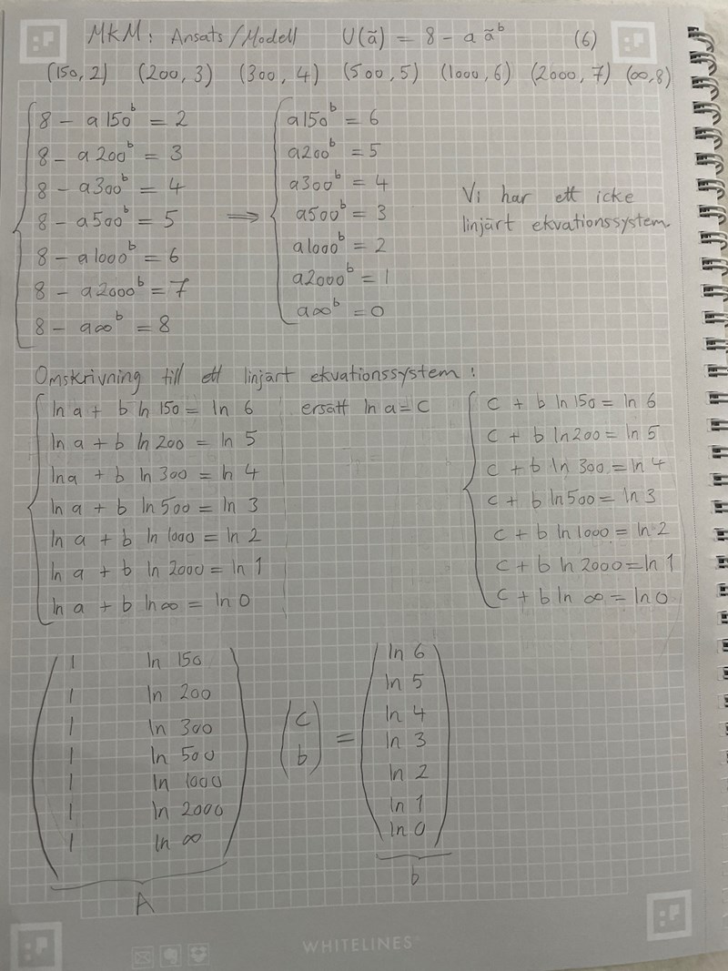 Detta är en linjär ekvation i ln(a)\ln(a) och bb. Gör du på samma sätt med övriga ekvationer kommer du också få linjära ekvationer i ln(a)\ln(a) och bb. Detta linjära ekvationssystem kan du sedan tillämpa minstakvadratmetoden på och få ut en approximativ lösning på ln(a)\ln(a) och bb