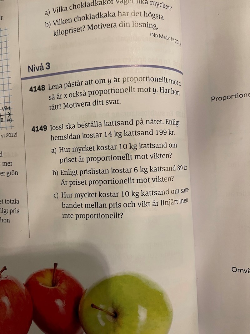 Hej jag behöver hjälp med 4149 c). Om set ska vara linjört med ej en proportionalitet, ska ju förhållandet kunna beksrivas som y=kx+m. Jag vet ju att 10 kg kostar ca 142 kr om det var en proportionalitet. Hur kan jag i sin tur ta reda på kostnaden om det ej var en proportionalitet ?