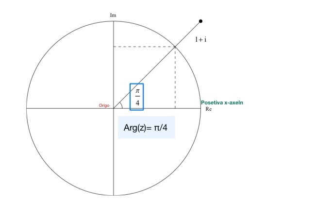 Arg(z) = 1 + i är π/4 pga vinkeln mellan den positiva reella axeln
