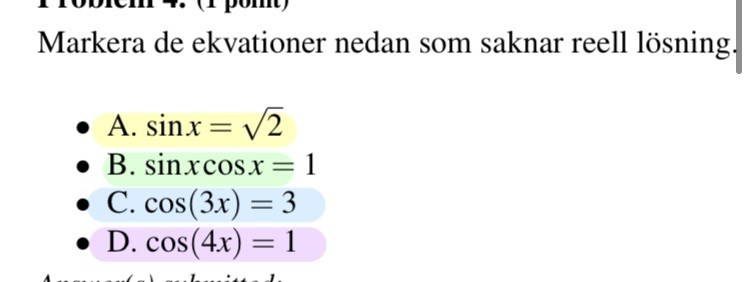 Tror jag kommit fram till att A inte stämmer eftersom för sambandet för sinv gäller att om roten ur 2 är en lösning kommer också - roten ur tvä vara en. Men roten ur - två är komplext tal därmed ej reallt.