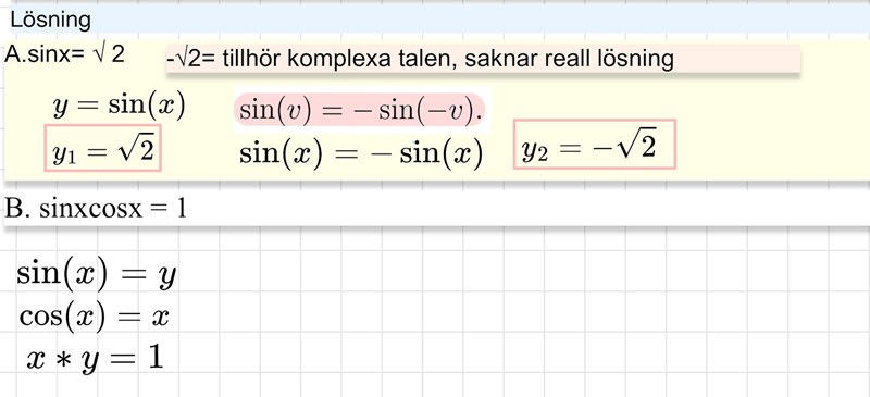 för B ansatt jag sinx= y & cosx= x. Och vet ju att trig 1 innebär att båda ska kvadreras. Så känns som att den inte heller borde stämma. Men som sagt väldigt osäker på hur jag ska tänka:)