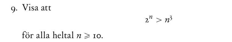 Då följer olikheten $$2^{n+1}>(n+1)^{3}$$ omedelbart från induktionsantagandet att $$2^{n}>n^{3}.$$