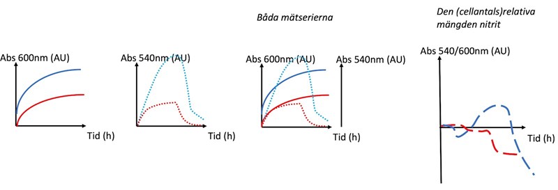 Och i kurvan längst till höger med den cellantalsrelativa mängden nitrit, är det som att man tar varje mätpunkt i diagrammet till vänster, t.ex. en punkt (Abs1, Abs2) och delar de på varandra? För att visa på de relativa förhållandena bakterier/nitrit? För att man annars löper risk att nitritkonc. minskar pga att bakterierna minskar i allmänhet?