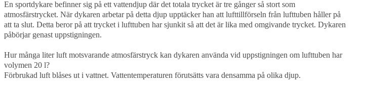 Jag får fram att volymen ska vara 60 l, men facit säger 40 l. Förstår inte riktigt hur de får fram det. Jag använde gaslagen.
