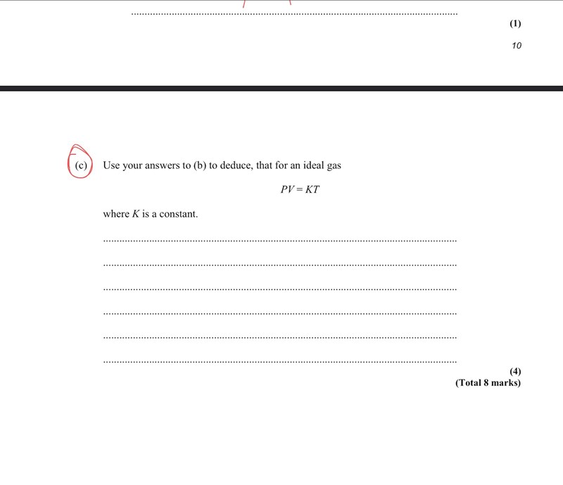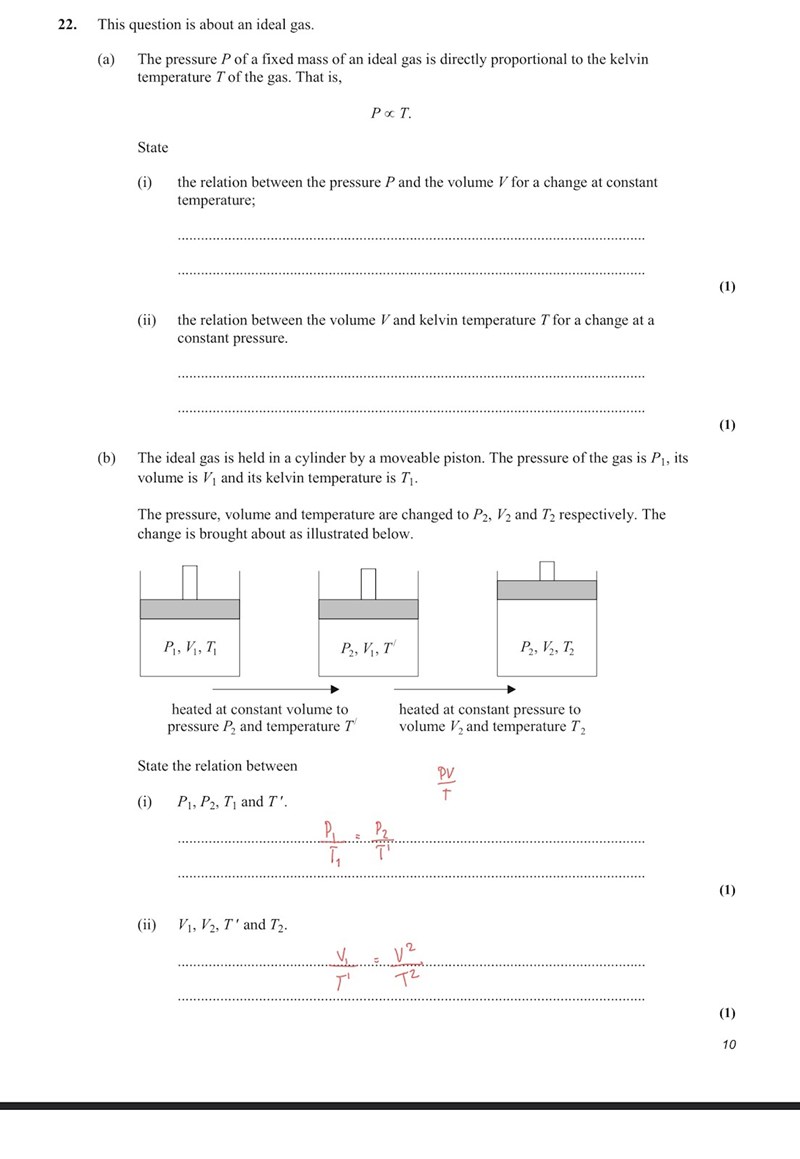 De har hittat två olika uttryck för T’ (från de tidigare uppgifterna) och satt dessa uttryck lika med varandra. Sedan har de skrivit om ekvationen så att man har PV/T i bägge led. Det ekvationen då säger är att PV/T vid en temperatur är likadan som PV/T vid en annan temperatur. Med andra ord att värdet hos detta uttryck är konstant.