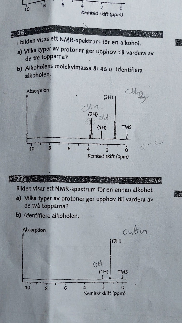 Hej där! Jag löste uppgift 26 genom att bestämma summaformeln som blev C2H6O vilket jag identifierade som etanol (rätt svar). Sedan i uppgift 27 skulle jag göra samma sak, och jag använde mig av samma metod. Då fick jag butanol som svar, vilket är fel. Jag misstänker att det har något att göra med att väteatomerna ska se "rätt grannar" eller sådant, men jag glömde vad det handlade om. Varför funkade metoden i uppgift 26 då? Är det för att väteatomerna i etanol redan satt rätt? Tacksam för hjälp med detta. 😅