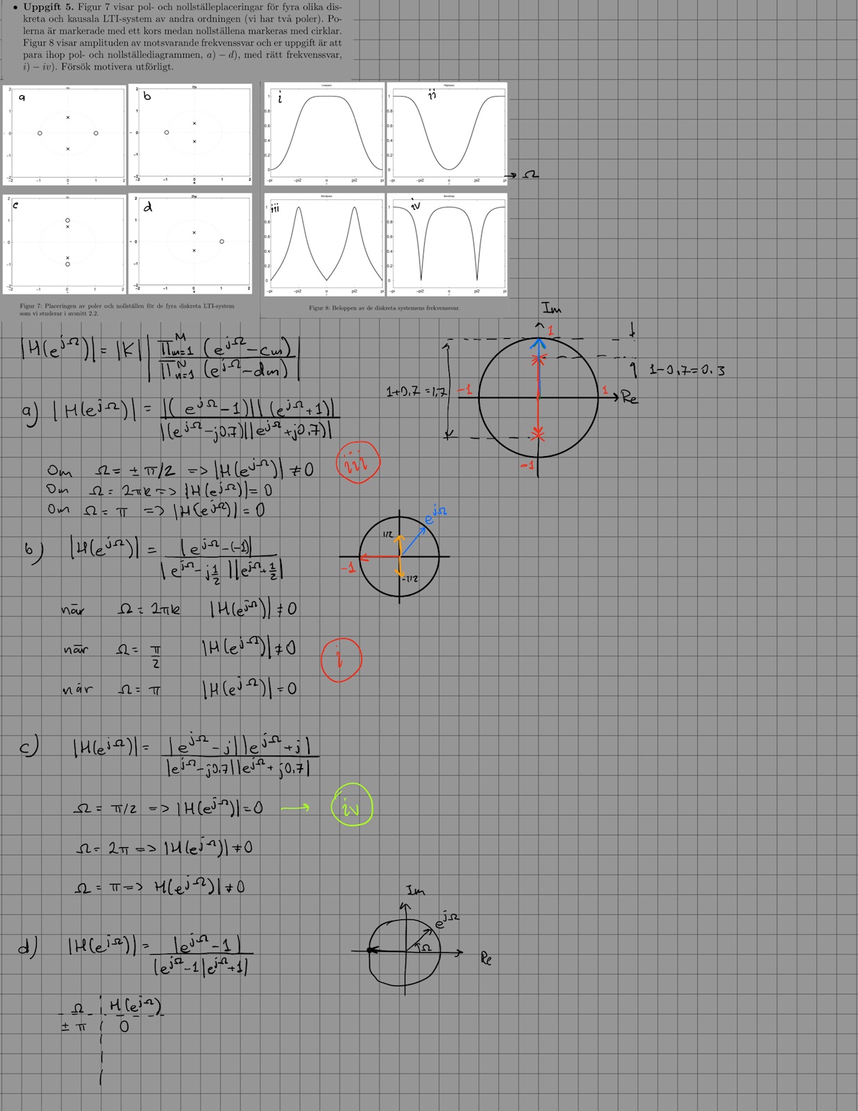 Jag börjar med att ungefärligt skriva upp , sen kollar jag värdena för amplituden för när Omega är 0, pi/2 och pi. Jag får att för polerna till (a),(b) och (d) så är amplituden 0 för Omega=pi. Och det är endast (i) och (iii) som är 0 för Omega=pi, alltså det fattas ett alternativ för (d) vilket måste vara fel från min sida. Ser dock inte vad som möjligen kan vara fel då (a), (b) och (d) endast har realdel för poler.