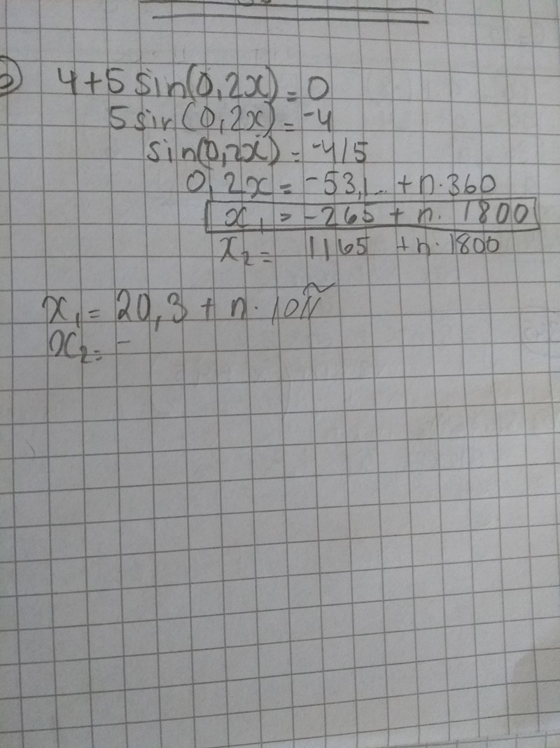 Jag är med på vad du gör tills du kommer till . Sedan ser du ut att ha räknat i grader, och du verkar ha tappat bort hälften av lösningarna. Om du räknar i grader borde du ha fått att 0,2x = -53,1 + 3*360 eller 0,2x = 233,1 + n*360.
