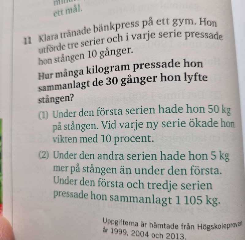 Det står ju i (1)-informationen. "Under den första serien hade hon 50 kg på stången". Så de obekanta i uppgiften ska man alltså bara leta efter i själva frågan, inte i (1) och (2)?