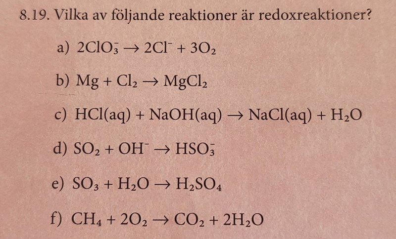 Kan någon hjälpa mig med hur man ska kunna se vilken av följande är redoxreaktioner? Vet hur en redoxreaktion fungerar men förstår inte hur man ser det på följande uppgifter.