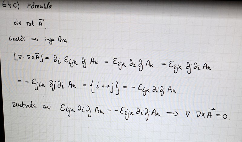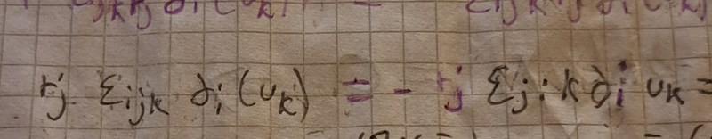 Jag är med på att eijk=-ejik men varför byter man plats på dj och di ? Och i nästa rad så är det dummy index mellan i och j. Där förstår jag inte riktigt varför dj och di byter plats och om dummy index gäller bara i epsilonindex? Borde det inte vara -(-eijk) i andra raden ?