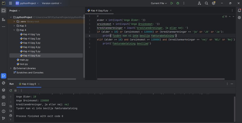 Jag tror inte ditt sista villkor, (kreditanmarkningar == ja or JA or Ja) gör vad du tror det gör. Ett sätt att få det att göra vad du vill att det ska göra är att skriva (kreditanmarkningar in [ja, JA, Ja]). Eller kanske ännu enklare (kreditanmarkningar.lower() == ja) för att konvertera texten till små bokstäver och slippa hantera alla olika fall