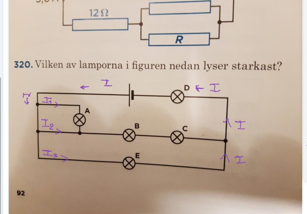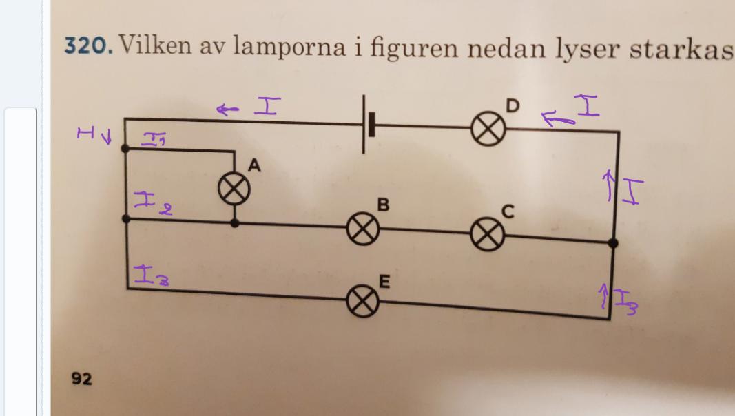 När det gäller B,C och E,kommer strömmen att välja vägen med mindre resistans. E vägen har bara två lampor E och D, i motsats till B,C och D vägen, som består av tre lampor( större resistans). Har jag börjat förstå rätt?