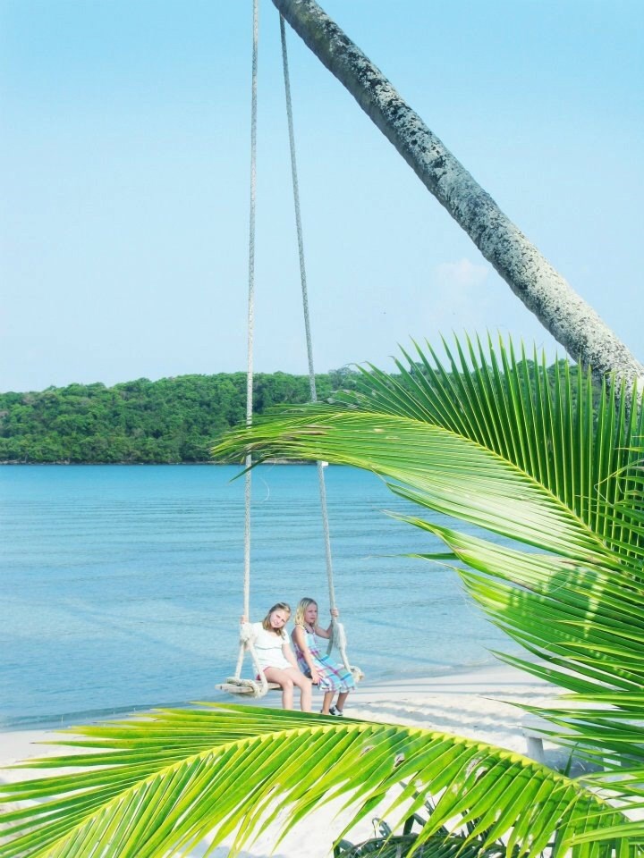 Pienso que esta fotografía es muy bonita, con las hojas de palmas verdes y el mar azul en el segundo plano. Hacía muy calor cuando la madre de mi amiga tomé la foto, no había ninguna nube en el cielo y el sol brillaba. Las dos chicas en la foto son mi amiga y yo, sentó en un columpio que colgó de una palma. La madre de mi amiga tomó la fotografía después habíamos dando un paseo largo o la largo de la playa.