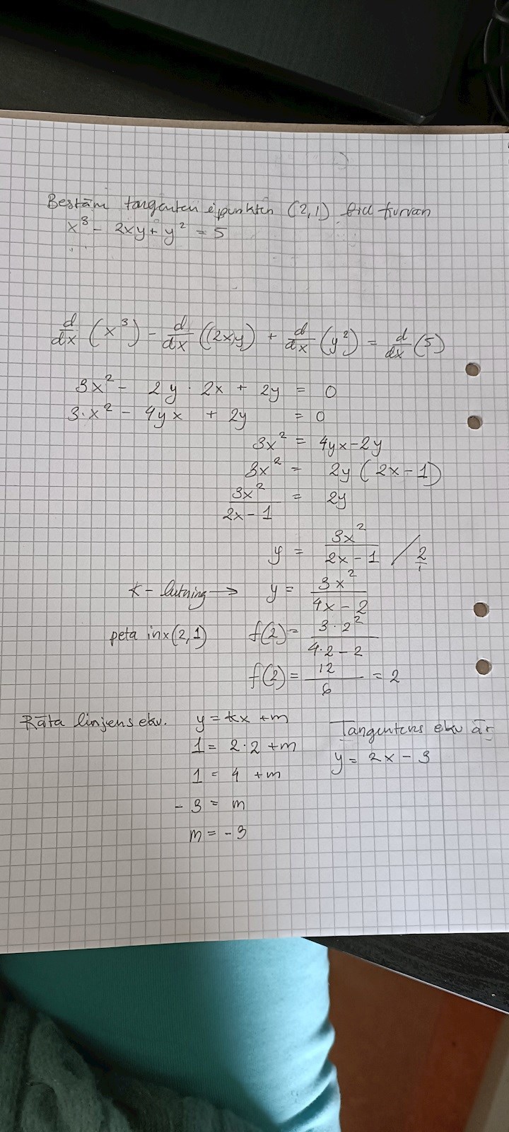 Så jag sitter här med en uppgift och undrar om jag har tänkt rätt, Jag ska hitta tangenten till ekvationen x3 -2xy+y2=5 med hjälp av punkten (2,1). Tacksam om någon kan titta på denna.