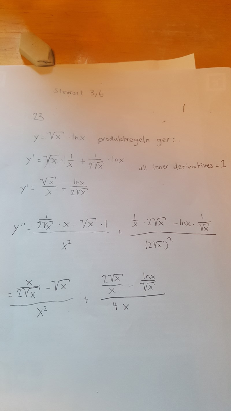 Jag får detta svar, men facit säger f'(x)= (2+lnx)/(2sqrt(x)) och f''(x)=-lnx/(4x*sqrt(x)).