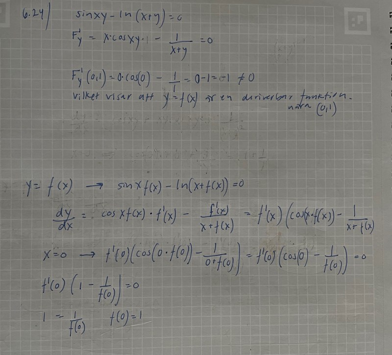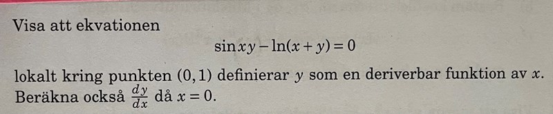 Derivatan y'(0) borde väl ges av -(dF/dx)/(dF/dy)(0,1), där F(x, y) = sin(xy) - ln(x+y)?