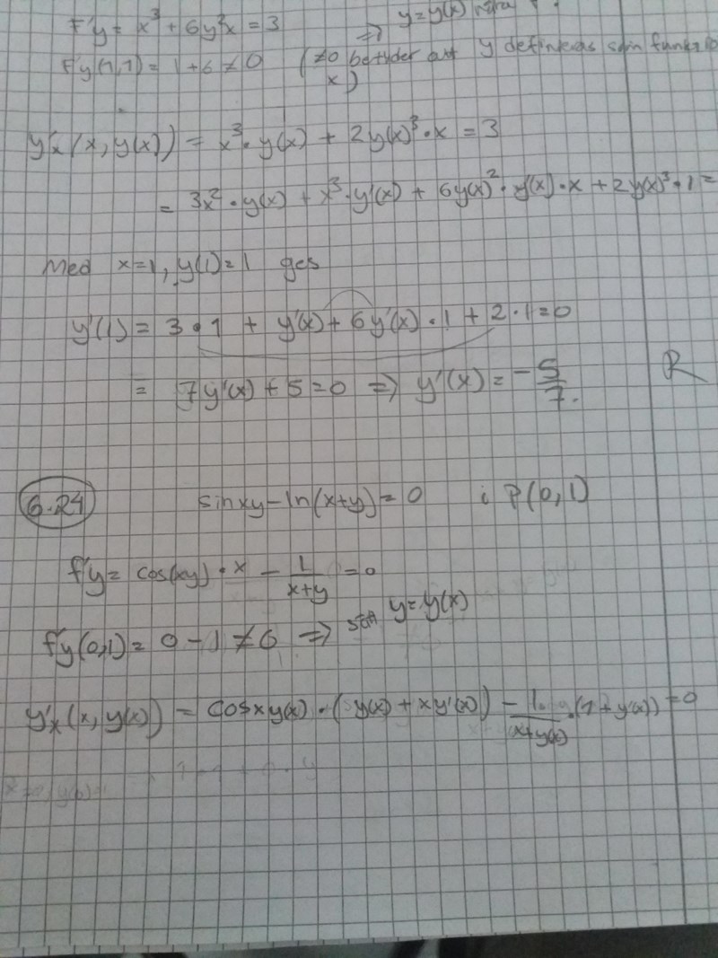 Tja, Tack för svar och ursäkta sent svar. Undrar hur du fått den sista ekvationen? Jag måste ha gjort fel då eller har du bara skrivit det annorlunda? Jag tror att vi får samma svar men jag tänkte att när jag deriverar den sista Y'x (x, y(x)) så har ju båda funktionerna inre derivator som ska deriveras också väl? Dvs xy(x) i sinxy och ln(x+y)? Eller tänker jag fel här?