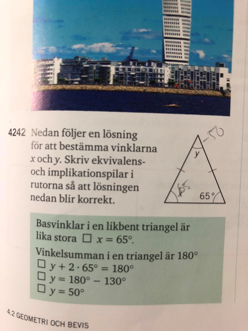 Jag förstår inte påståendena.. vad betyder y+2*65=180 i förhållande till ”vinkelsumman i en triangel är 180”... Vart är påståendet? Jag förstår inte hur man ska avläsa det..?