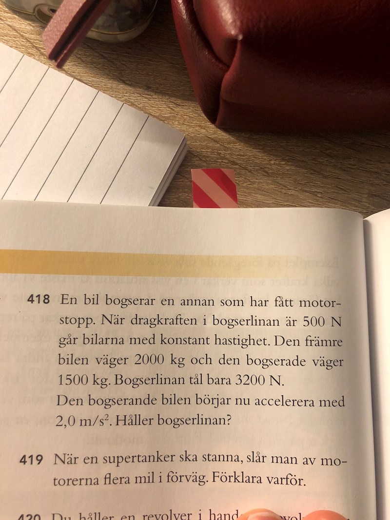Jag behöver hjälp med 418. Förstår inte riktigt hur man ska tänka där. Om bogserlinan mellan bilarna är 500N och sedan accelerar bilen som blir dragen av en annan, varför adderar man 500 N?