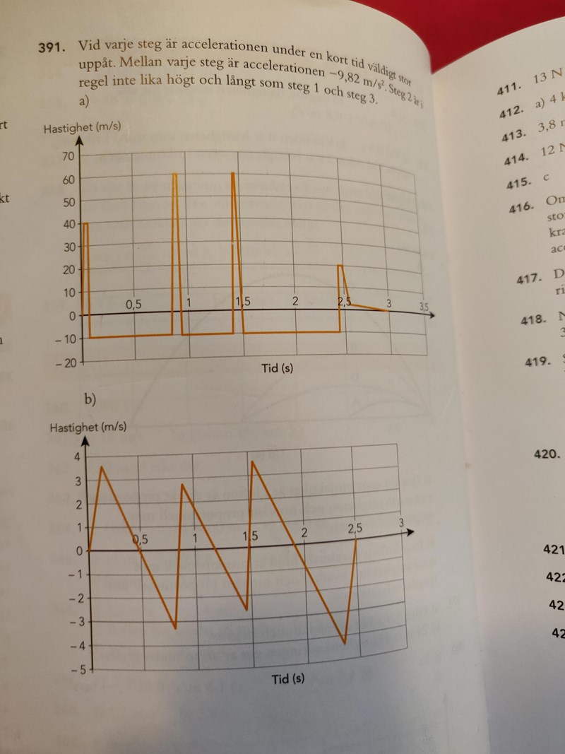 Smaragdalena skrev:Första grafen i facit verkar ha fått fel enhet på y-axeln - det verkar handla om acceleration mätt i m/s2, inte hastighet i m/s.