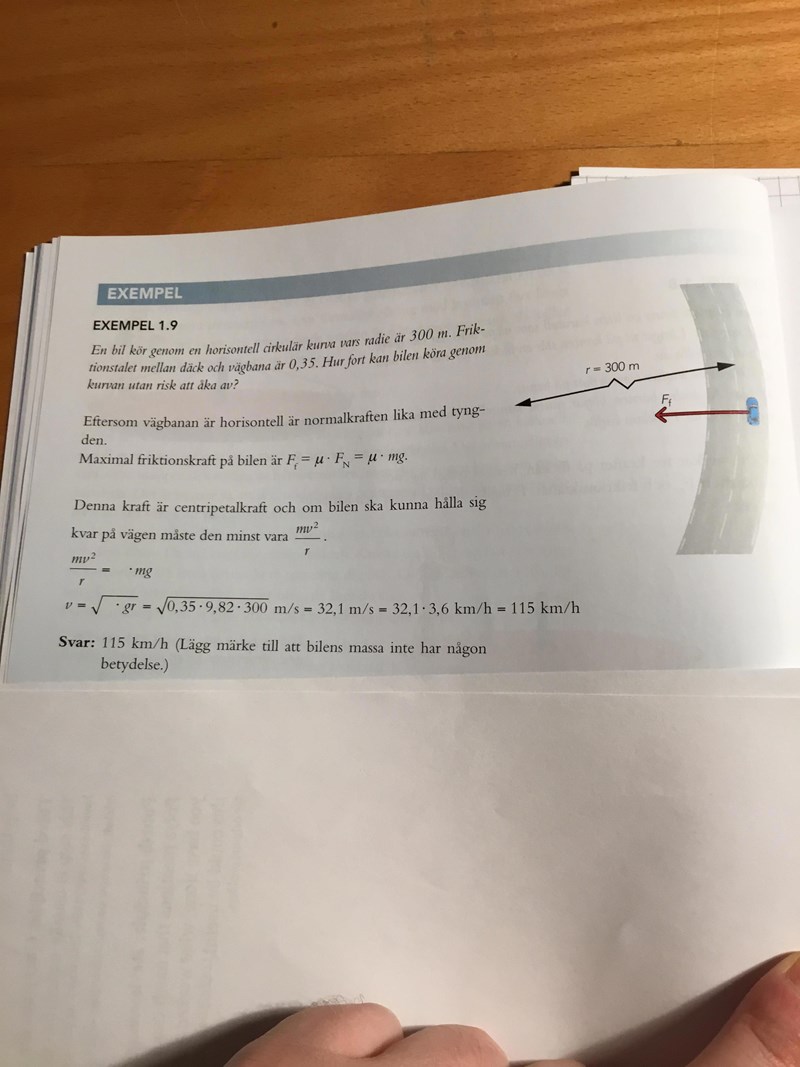 Har de bara struntat i skriva 0,35 i den nedersta delen? Och sen hur kommer det sig att massan inte spelar något roll, så vad då om jag kör med en stridsvagn eller en motorcykel, så spelar det ingen roll hur fort jag kan ta kurvan. Stridsvagnen har väl i för sig större friktion, och motorcykels väldigt låg friktion men a.