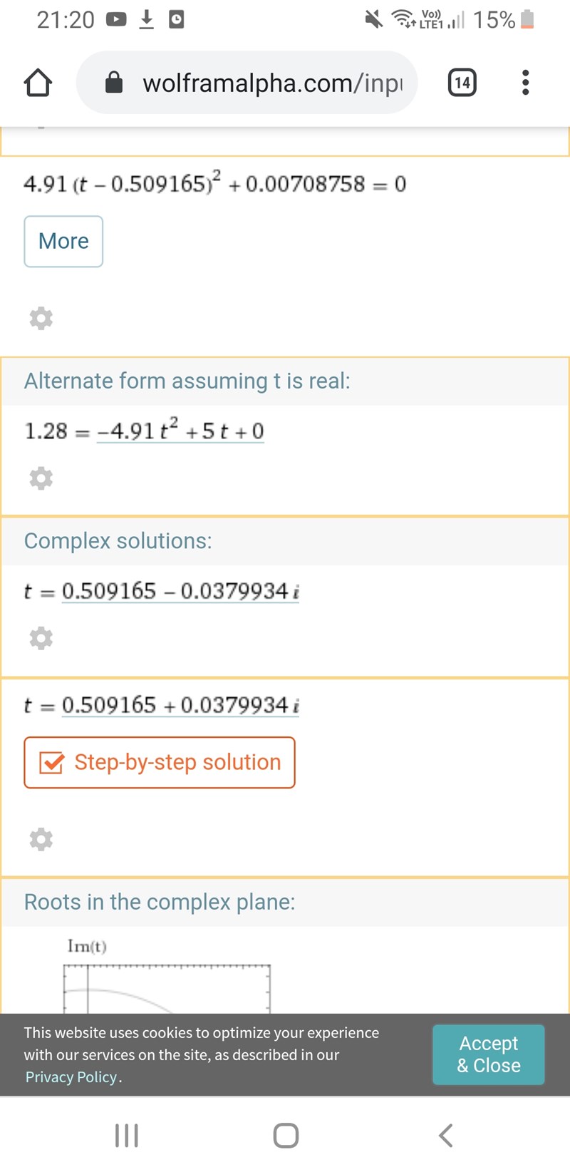 Vi har inte än lärt oss lösa andragradsekvationer så vi fick en länk till en webbsida som heter wolframalpha och han sa att vi ska skriva in de där och så löser den ekvationen åt oss. Problemet var att när jag gjorde detta blev svaret roten ur ett negativt tal. Det kan ju inte bli en imaginär tid.
