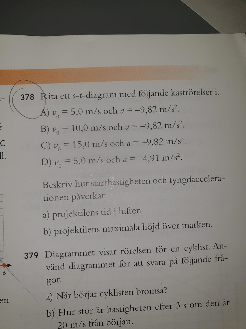 När jag löste den gjorde jag så att jag räknade först ut steckan utan tiden genom att kombinera två rörelseformel. Sedan tänkte jag räkna ut tiden. Efter det skulle jag ha all information jag behöver för att rita detta st diagram. (PS. räknade ut högsta höjden och sedan tiden det skulle ta för den höjden v=0)
