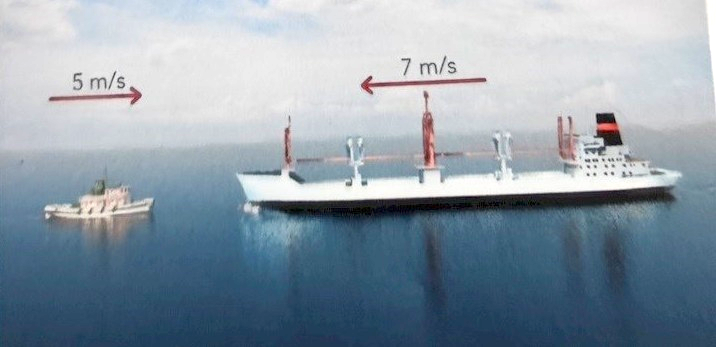 Om den stora båten fortfarande hade en hastighet på 6,8 m/s (13 knop) skulle jag slå vad på att den hade tagit med den lille båten under sig...