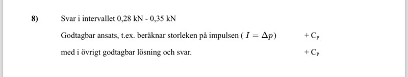 Vi jobbar med energi, rörelsemängd och impuls osv. I=ΔP ska vara en viktig del av uppgiftenSå hur stor är impulsändringen i det här fallet? Ingen aning, läste bara det i facit. Såhär ser facit ut