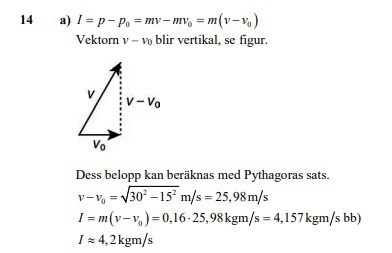 a) Använd figuren till att visa att impulsen som pucken får vid slaget är vinkelrät mot hastigheten V0, beräkna impulsen.