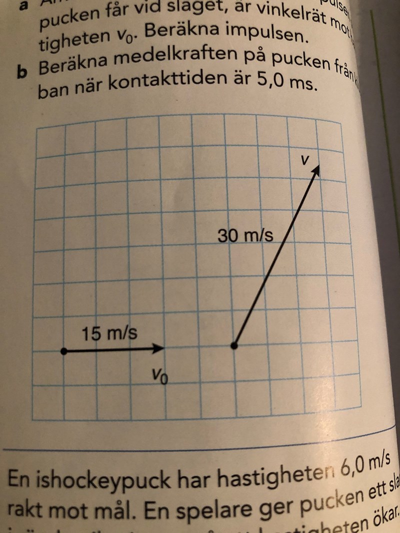 En ishockeypuck som väger 0,16 kg får ett slag från en klubba så att den ändrar sin hastighet från V0 till V enligt figuren i boken.