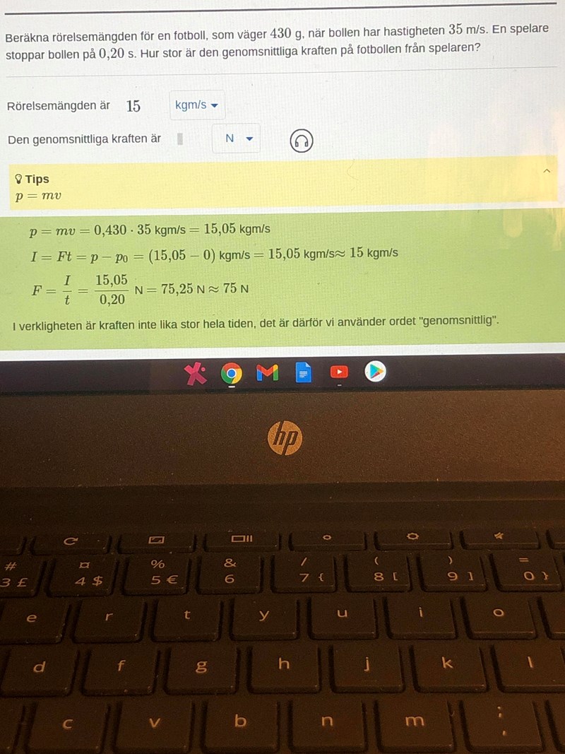 Men frågan är bara hur stor kraften är, och det är 75 N oavsett om kraften är riktad med eller mot bollen. Plus och minus har alltså ingen betydelse i det här sammanhanget. Därför har de nog bara satt 15.05 - 0 för att få positiva tal, så behöver man inte lyfta frågan om riktning.
