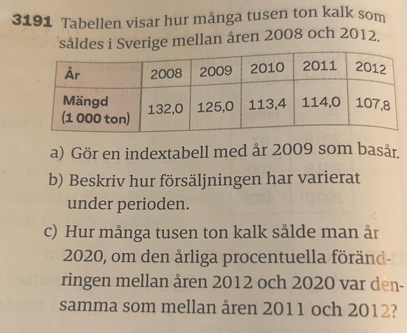 Är 2008 såldes det 132 ton. Detta är 132/125 = 1,056 = 106 %, så indes för 2008 är 106.