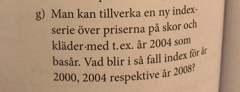 Smaragdalena skrev:Du skall göra en ny indexserie med basåret 2004, det betyder att du skall ha värdet för år 2004 i nämnaren hela tiden. Index för år 2002 blir då 164,47/161,38 = 1,02 vilket ger ett index på 102, men man frågar inte om index för 2002 i den här uppgiften, bara för 2000, 2004 och 2008.