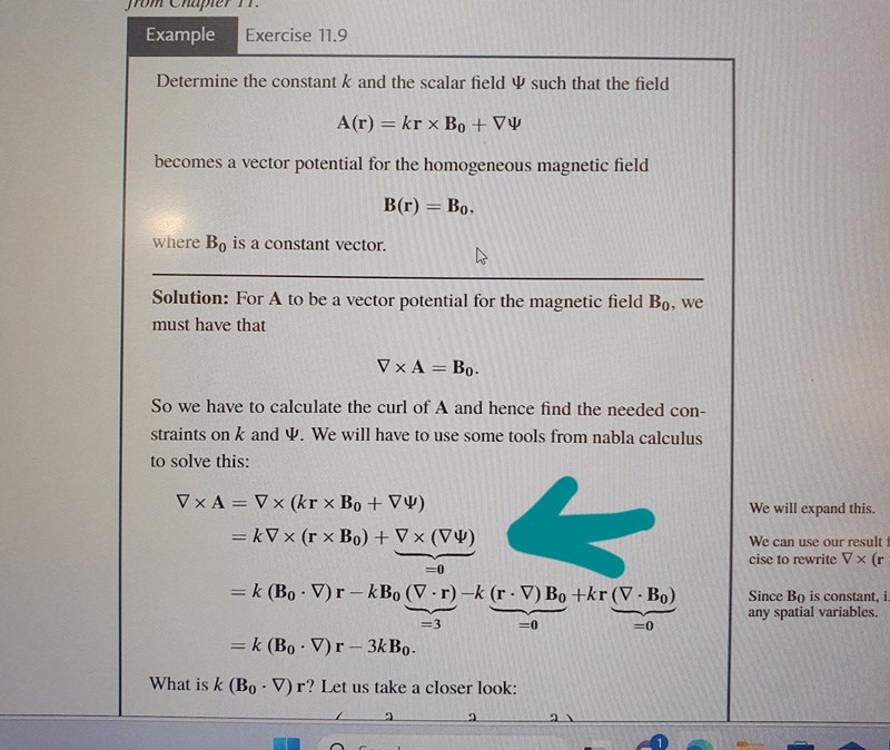 Rot(grad(A))=0 för alla skalärfält A. Detta eftersom att grad(A) är ett konservativt fält (med potential A) och rotationen av alla konservativa fält är 0. Tänk på en linjeintegral i ett konservativt fält. Alla kurvor från a till b kan ersättas med den raka sträckan från a till b.