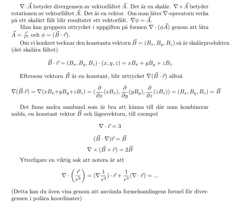 skrev det på tenta men fick kommentaren "logisk fel" kanske något annat de syftade på men då är alltså så att vi tar nabla skalär med en vektor? för B skalär r är en skalär som delas med en konstant som sedan multipliceras med en vektor?