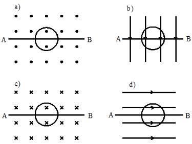 Nedan visas fyra magnetfält riktade åt olika håll. I vart och ett av dessa fält a) - d) finns en cirkulär slinga som kan rotera kring en axel AB. I vilken eller vilka av situationerna a) - d) induceras det en spänning över slingan? Förklara varför.