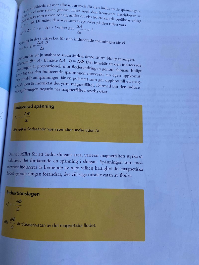 2. Jag förstår inte formeln längst ner i den gula delen (Induktionslagen) vad är anledningen till att Spänningen motsvarar derivatan av hur mycket flödet ändras