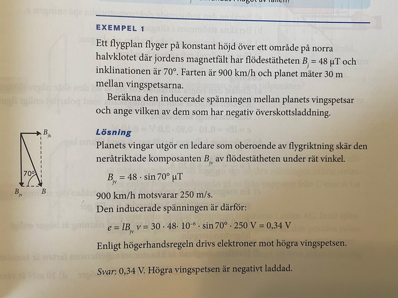 I uppgiften står det "Planetsvingar utgör en ledare som skär den nedåtriktade komposanten Bjv av flödestätheten under rät vinkel". Jag pekar pekfingret vertikalt neråt eftersom komposanten till flödestätheten är riktad så. Strömmen "är" tummen och den är vinkelrät mot B men jag tänker att strömmen går motsatt riktning till planets färdriktning eftersom planet är en ledare och elektronerna i den följer med åt samma håll, och jag har för mig att strömmen går åt motsatt håll som elektronerna. Alltså om jag skulle se planet framför mig när jag använder högerhandsregeln pekar mitt pekfinger ner, tummen tillbaka mot planet vilket gör att jag får kraften riktad åt vänster eftersom  kraften "ges av mitt böjda långfinger". Men i lösningen står det att elektronerna drivs mot höger vingspets.