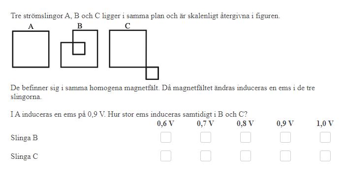 Ser du att i B går pilarna medsols, både i den stora och den lilla kvadraten och den stora kvadraten-minus-en-liten-kvadrat? Den stora biten bidrar med 0,8 V, den lilla med 0,1 V.