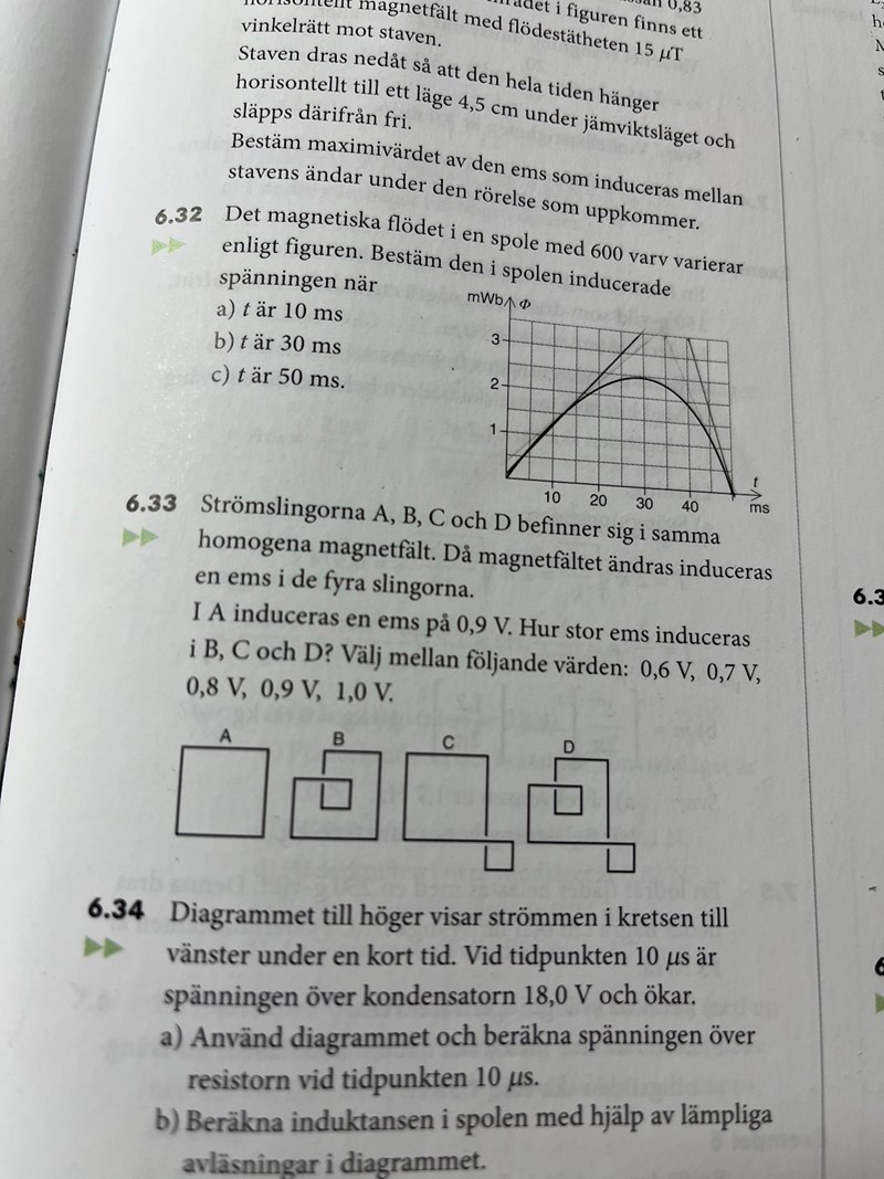 Hej, jag behöver hjälp med 6.33. Jag vet att man får fram ems genom att titta på ändringen i flödet under en viss tid och jag vet också att flödet beräknas med B*A. Areorna kan jag jämföra/uppskatta. I B tänker jag till exempel att arean är 8/9 av i A och utifrån detta skulle spänningen alltså vara 0,8 V. Men det verkar inte vara riktigt så enkelt, för svaret är 0,9 V. Jag misstänker att kanske strömmen som skapas kan påverka, men vet inte hur…