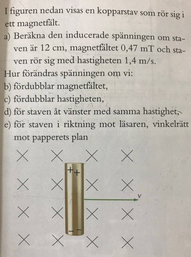d) Formeln är ju och om man nu ändrar riktning på v blir spänningen negativ enligt formeln ?